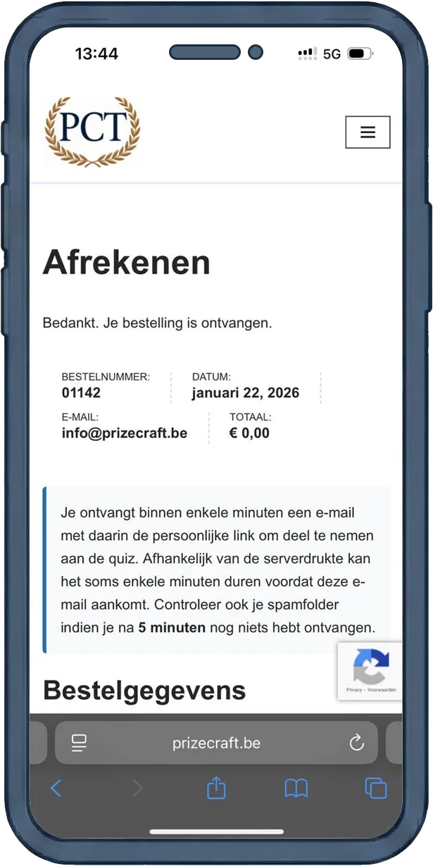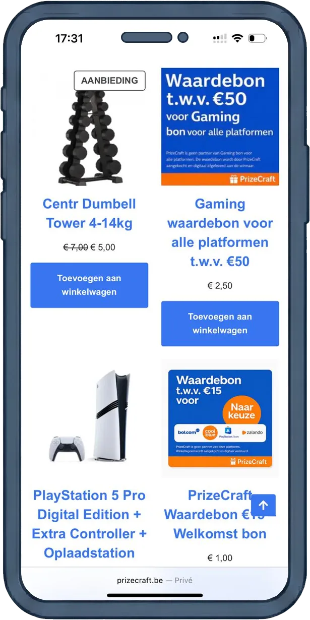 PrizeCraft organiseert vaardigheidswedstrijden conform de Belgische wetgeving. De winnaar wordt uitsluitend bepaald op basis van correcte antwoorden en beantwoordingstijd. Er wordt geen toeval, loting of willekeur toegepast. De prijzen staan vooraf vast en zijn niet afhankelijk van het aantal deelnemers.