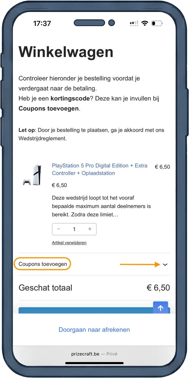 Indien je een coupon hebt kan je deze invullen door ‘Coupons toevoegen’ te klikken en door te gaan naar afrekenen.